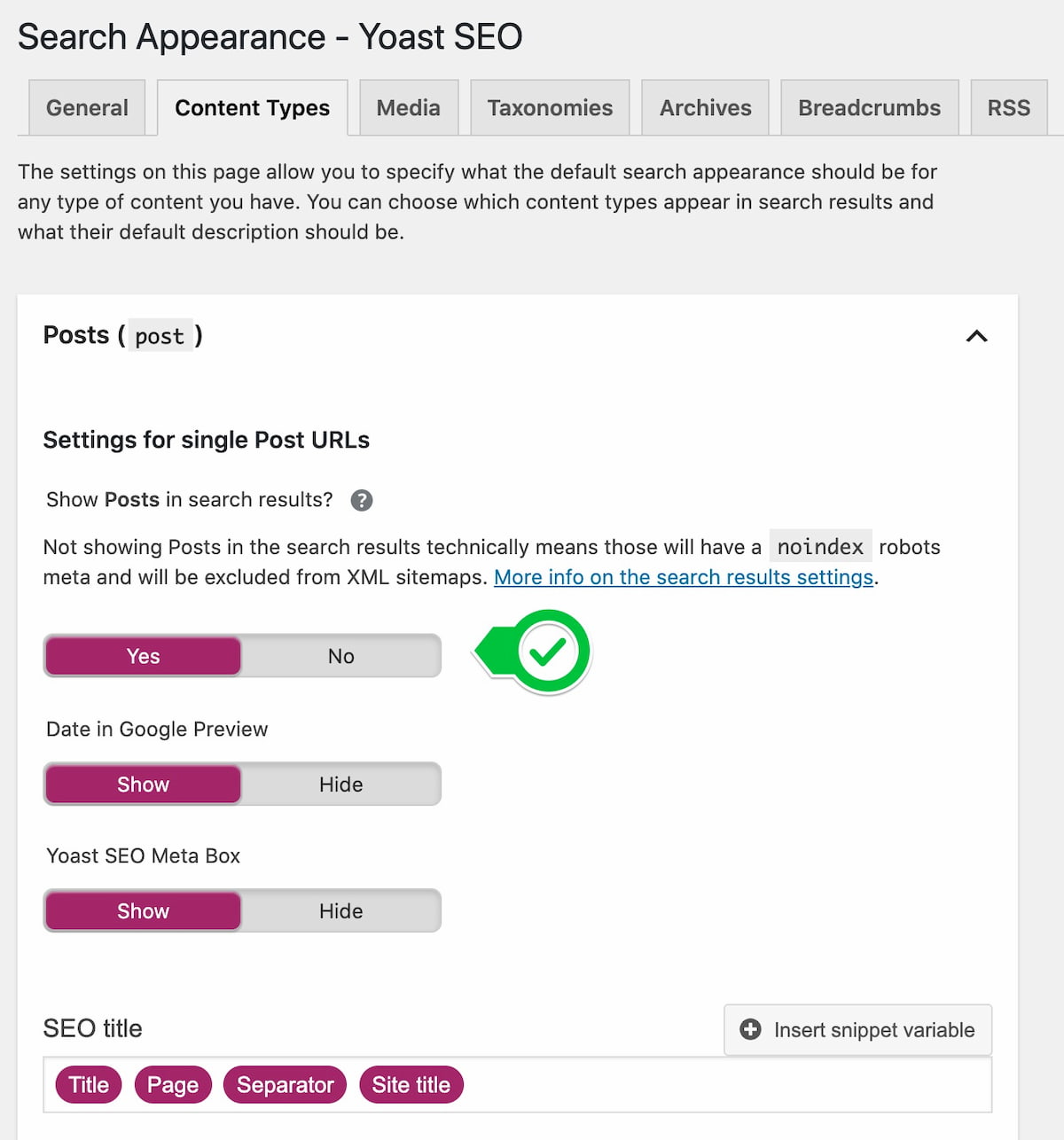 You can find the individual settings for making your content available for indexing in the corresponding parts of Yoast SEO Company. You’ll find the settings for posts and pages in the Content Types part of the Search Appearance tab. Taxonomies like categories and tags can be found in the Taxonomies tab.